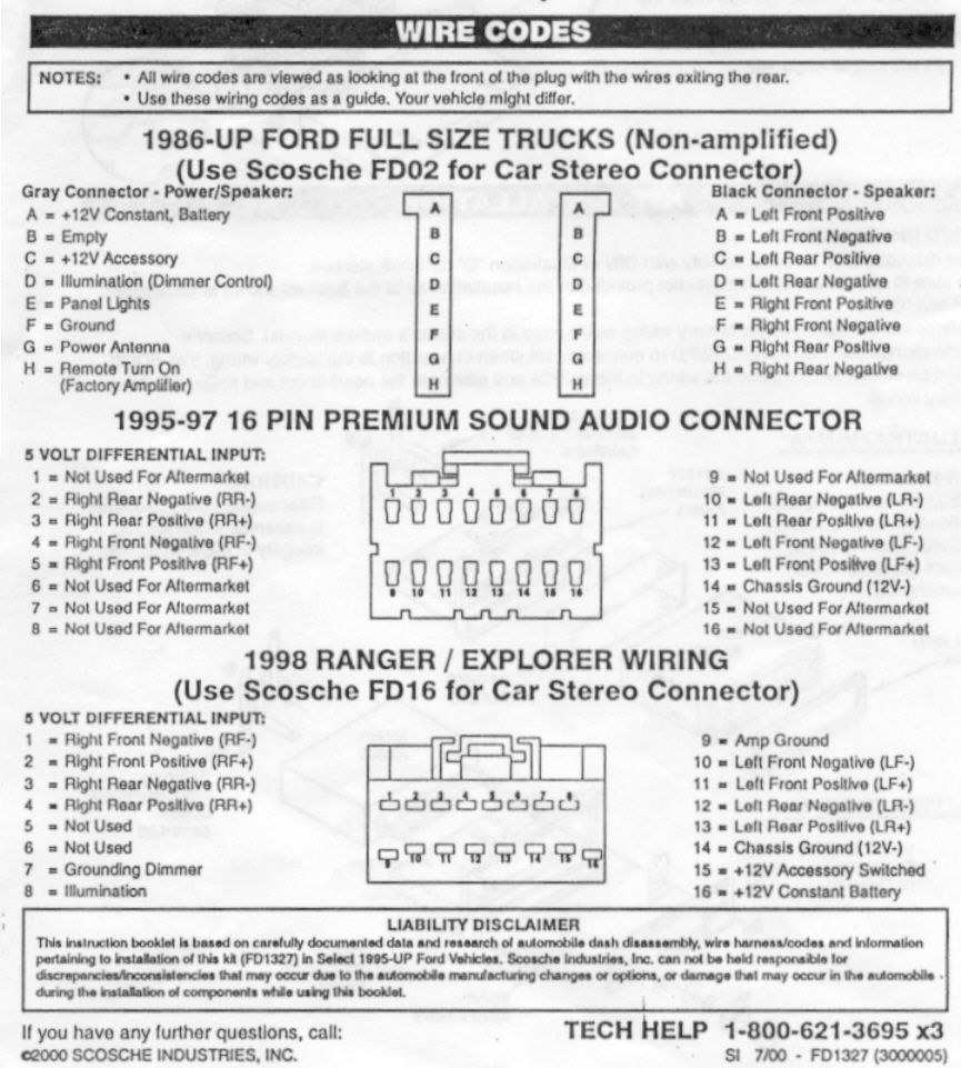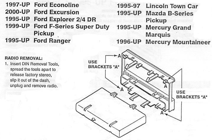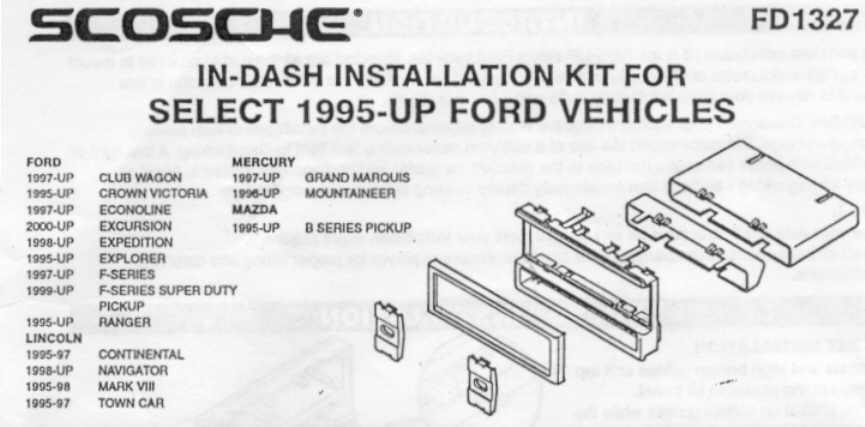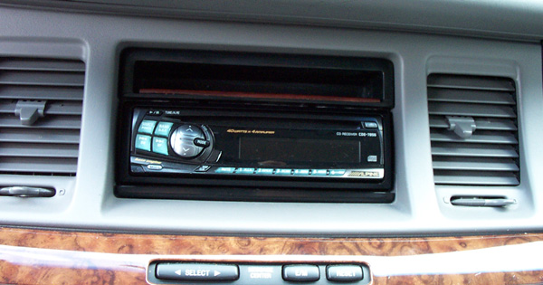 However, I cannot get the harness of speaker for my factory head unit, and I never found the by-pass neither. I only got the one for power, and I actually only use three of them( 12V constant, 12V power, and ground), So I actually even cut out harness after while. Speaker wiring: The hardest part of head unit, you have to figure how the wire goes from the head unit to the amplifier, and from the amplifier to the speaker. In my case, cut out the factory connector (or harness), connect them to the new speak output from my new stereo (head unit). Go to the amperifier in the trunk. On the amperifier, there are three connectors, one is power, one is speaker signal input, another one is speaker output. Ignore the power, Connect the input and output together (because we cannot use the amperifier any more). However, it is not easy to figure out which one goes to which one, and which one is Negative, which one is Positive, they both work, but don't sound right.So I suggest rewiring the whole speaker cable. Antenna: The car's antenna is on the back window. The wire goes through a little box (located between the two rear speakers), and connect to the factory amperifier. The antenna connector in our cars is for Ford only, most (or all) the stereos you buy has a standard antenna connector, you might have to get another Antenna harness for Ford to plug into your new stereo, it is around $15. What I did is, I bought a new antenna (around $15), and an extention antenna cord (the longest available, barely long enough), I placed the antenna in the trunk, routed the cord to the front and connect to my new stereo (see rewiring speaker for how to wire the antenna cord). I don't think this is a good idea, Maybe you can just buy a antenna harness instead, but you still have to re-route the antenna cord to the front. Installation kit: Kit details: Page 1, 2, 3, and 4. Since the stereo is Double Din size, you can buy a so called installation kit to mount your new stereo into the dash. Scosche (R) was recommended by Joe Pettitt in his book "High Performance car stereo". There are many of them that may fit your car from their website, but I only can get model FD1327 from "Good Guys". Scosche's kit has an opening for a stereo and another "pocket" for CDs (or coins, small things). The instructions indicated that I should put the stereo above the pocket, but it was to hard, and I put the pocket above the stereo.